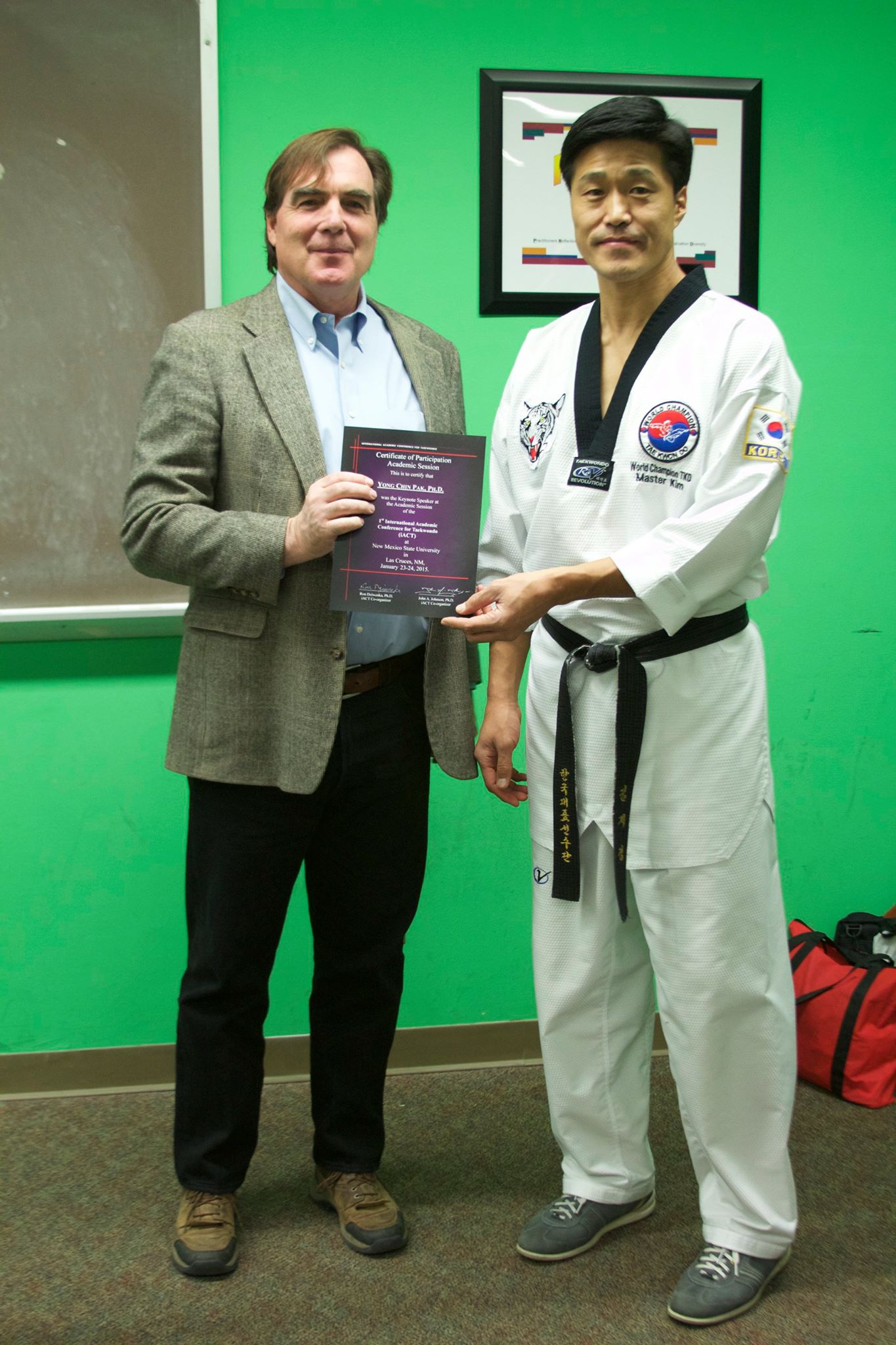 On January 23 and 24, 2015 the first ever International Academic Conference for Taekwondo took place on the campus of the College of Education of New Mexico State University in Las Cruces. The conference was billed as a collaboration of physical training and academic discourse for all on Taekwondo as a martial art and martial sport in 2015. This important gathering garnered full support from the University, including their Honors College and Office of International and border Programs. The Dean of the Education College Dr. Michael Morehead, Ed.D addressed the group several times and even hosted a dinner for the presenters and organizers. The local Mayor Pro-Tempore Greg Smith was on hand to assist in presenting gifts and certificates to the participants.
